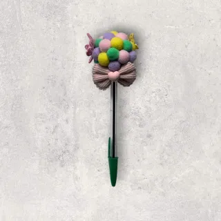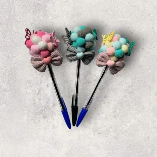 Bolígrafo decorado con pompones y lazo