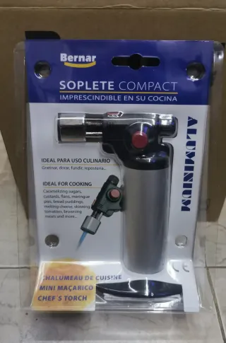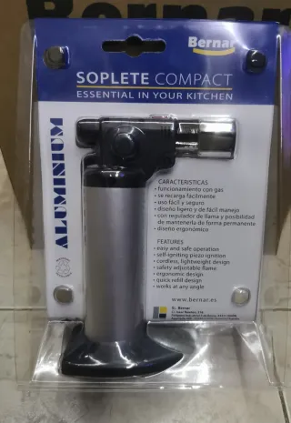 Soplete compacto ideal para uso culinario. Permite gratinar, dorar y fundir ingredientes. - Diseño compacto y fácil de usar. - Cuerpo de aluminio y detalles en plástico negro. - Ideal para caramelizar azúcares, flanes, merengues, gratinar quesos, dorar carnes y más.