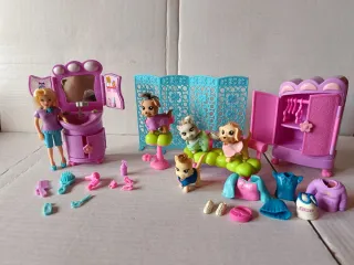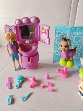 Conjunto de peluches de Minnie Mouse de Disney. - Peluche grande con gafas y lazo. - Peluche con vestido rosa de lunares. - Peluche con vestido rojo de lunares. - Peluche con sudadera roja y falda vaquera.