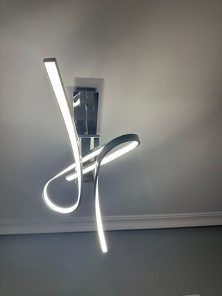 Elegante aplique de pared con un diseño moderno y curvo. La luz que emite es fría, creando un ambiente contemporáneo. - Acabado en plata y blanco. - Fabricado en metal y plástico. 30W