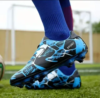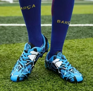 Botas de fútbol para niño con un diseño moderno y llamativo. - Color: Negro y azul. - Detalle de estampado. - Cierre con cordones. - Suela con tacos para césped.
