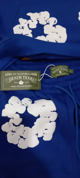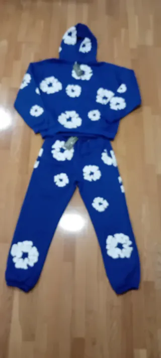 Conjunto de chándal completo con un diseño llamativo de flores blancas sobre fondo azul. Ideal para un look casual y cómodo. - Sudadera con capucha. - Pantalón largo. - Estampado de flores blancas.
