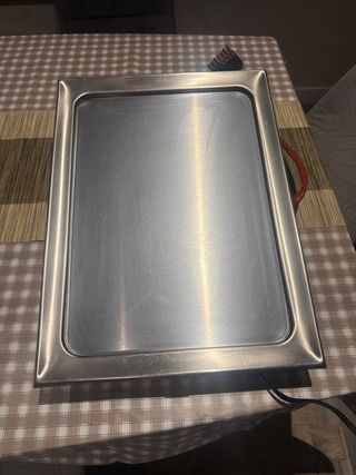 Plancha eléctrica de sobremesa de la marca Gaggenau. Superficie lisa de acero inoxidable. - Diseño moderno y elegante. - Asas laterales rojas para un fácil transporte. - Cable de conexión incluido.