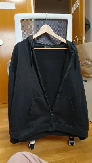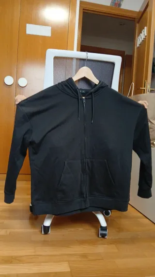 Chaqueta negra con capucha y cremallera completa. - Bolsillo canguro delantero. - Puños y bajo elásticos.