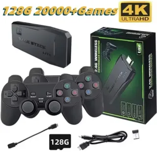 Consola de videojuegos retro con conexión inalámbrica. Incluye dos mandos para disfrutar de tus juegos favoritos. 128 GB. Nueva con plástico y caja. Ideal para regalar. Más cosas en mi perfil. - Salida de video 4K. - Conexión 2.4G inalámbrica. - Dos mandos incluidos.