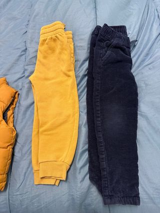Ropa de algodón para niño o niña en tallas 2, 3 y 4 años. - Pantalones amarillos/grises de tela suave. - Pantalones forrados azul marino de pana.