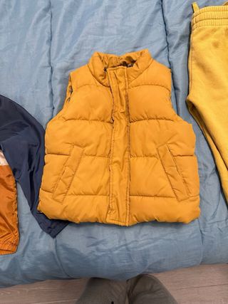 Chubasquero con capucha forrado en algodón para lluvia y viento; y chaleco forrado con borreguito muy calentito. Diseñados para ofrecer comodidad y protección. Tonos azul marino y amarillo mostaza. - Chubasquero impermeable. - Chaleco borreguito.