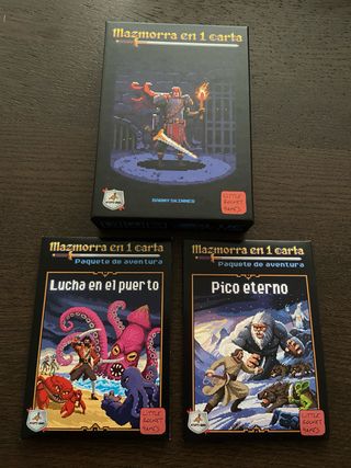 Pack de juegos de mesa Mazmorra en una carta. Incluye el juego base y dos expansiones. - Mazmorra en 1 carta (juego base) - Paquete de aventura: Lucha en el puerto - Paquete de aventura: Pico eterno