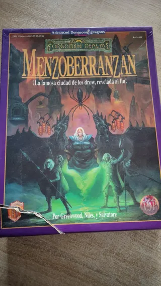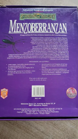 Menzoberranzan: ¡La Famosa Ciudad de los Drow, revelada al fin! Caja para el juego de Dungeons & Dragons (segunda versión). La caja está perjudicada, al igual que algunas fichas, que tienen muestras de haber recibido un golpe en la misma zona (ver detalles en las fotos). Falta el Libro Dos:Las Casas. Todo lo demás se encuentra en buen estado. Se lo recomiendo para quien tenga la caja y quiera renovar alguno de los suplementos si los tiene estropeados (y que no coincidan con los que vienen perjudicados o el libro que falta).