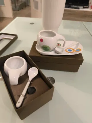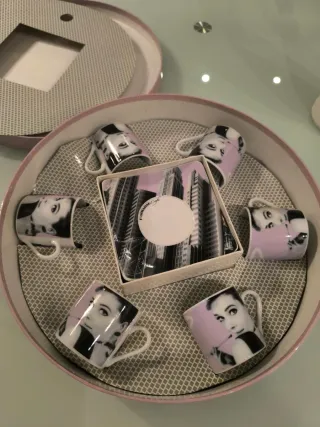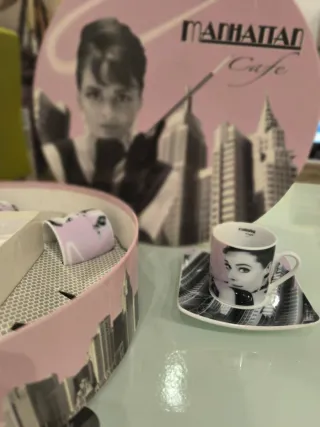 Elegante juego de café Manhattan con una icónica ilustración de Audrey Hepburn. Perfecto para añadir un toque de estilo a tu hogar. - Diseño inspirado en Manhattan. - Ilustración detallada de Audrey Hepburn. - Piezas de cerámica y porcelana.