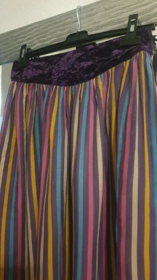 Falda con vuelo y estampado de rayas verticales en varios colores. La cintura es elástica y tiene un detalle de terciopelo. Bolsillos laterales. - Diseño de rayas vibrantes. - Cintura con detalle de terciopelo.