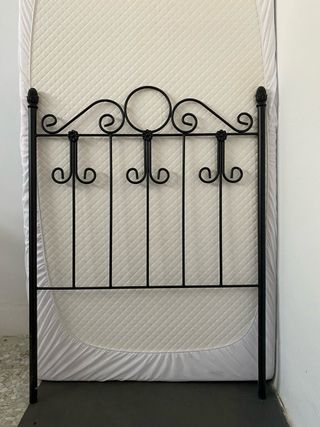 Cabecero de forja con un diseño clásico y elegante. - Estructura de metal resistente. - Acabado en color negro. - Detalles ornamentales en la parte superior. - 95 cm ancho x 1,28 cm alto