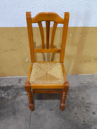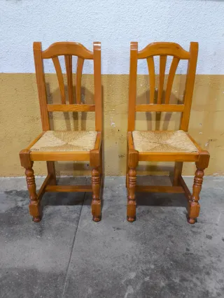 Conjunto de dos sillas de madera con un diseño clásico. - Se venden también por separado (15€ cada una) - Asientos de mimbre (uno de ellos hay que repararlo) - Patas torneadas. - Respaldo con varillas. - 4 cojines de regalo.