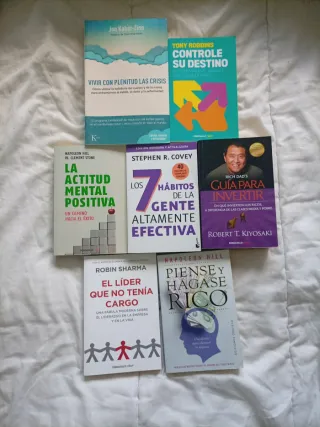 ¿Quieres transformar tu vida, mejorar tus hábitos o potenciar tu liderazgo? Este lote reúne 8 libros imprescindibles de crecimiento personal, inversión y motivación. Todos están en perfecto estado, como nuevos. Incluye títulos de autores reconocidos como Tony Robbins, Stephen Covey, Robin Sharma, Napoleon Hill y Jon Kabat-Zinn. Temas: mindfulness, actitud positiva, liderazgo, inversión inteligente y hábitos efectivos. 📚 Títulos incluidos: - Vivir con plenitud las crisis — Jon Kabat-Zinn - Controle su destino — Tony Robbins - La actitud mental positiva — Napoleon Hill y W. Clement Stone - Los 7 hábitos de la gente altamente