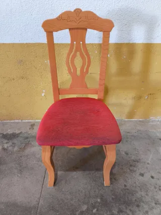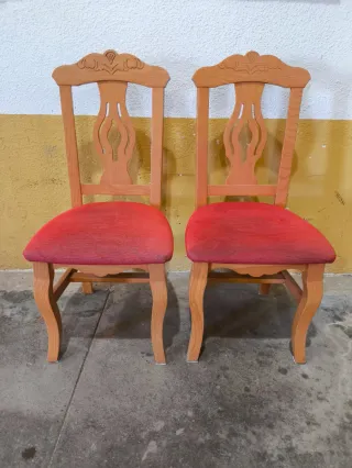 Conjunto de dos sillas de madera con un diseño clásico y elegante. Perfectas para dar un toque distinguido a tu comedor o salón. - Se venden también por separado (20€ cada una) - Asientos tapizados en tela roja. - Patas de madera curvadas. - Respaldo con detalles tallados.