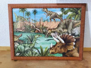 Precioso cuadro decorativo con un puzzle de dinosaurios. Ideal para amantes de estas criaturas prehistóricas. - Marco de madera. - Imagen vibrante de dinosaurios en su hábitat.