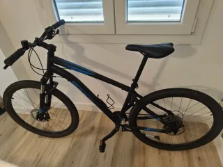 Bicicleta de montaña Rockrider en color negro con detalles en azul. Ideal para iniciarse en el ciclismo. En perfectas condiciones, apenas uso. Regalo casco. - Cuadro de aluminio. - Frenos de disco. - Suspensión delantera. - Ruedas de 27'5 pulgadas.