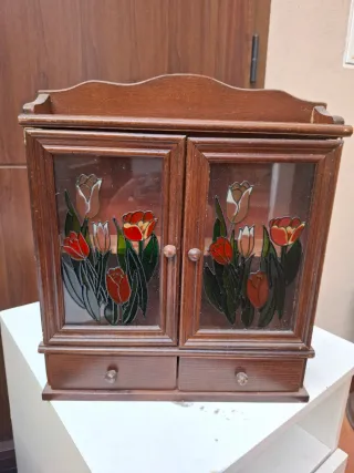 Pequeño mueble con puertas de cristal decoradas con tulipanes y dos cajones. - Diseño con puertas de cristal. - Decoración floral de tulipanes. - Dos cajones inferiores. Medidas. 7 ancho.27 largo Y 28xm