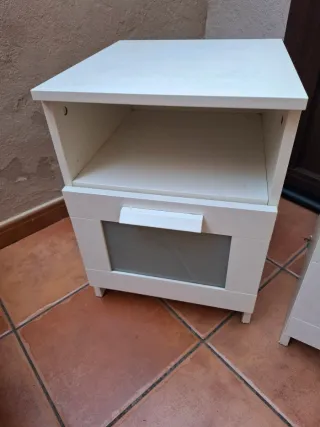Conjunto de dos mesitas de noche con un diseño moderno y elegante. - Acabado en blanco. - Frontal de cajón con detalle en cristal. El cajón abren y cierran perfectamente un pequeño deterioro en la pintura en una de ellas que e puede arreglar con una capa de pintura por lo demás están bastante bien Precio por las dos