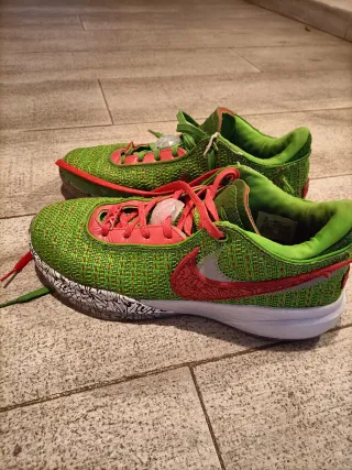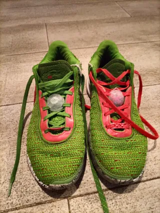 Zapatillas deportivas de baloncesto con un diseño llamativo. - Parte superior de malla transpirable en verde. - Detalles en color rojo. - Suela blanca con estampado. - Cierre con cordones.
