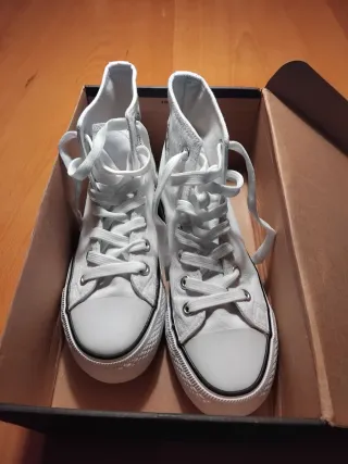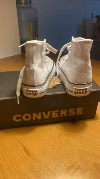 Botas altas Converse All Star en color blanco. Nuevas con embalaje originial. Mirar fotos. Un clásico que nunca pasa de moda. - Modelo de caña alta. - Cordones blancos. - Suela de goma. Usadas media hora porqué me estan pequeñas. Pone 38, pero tallan pequeñas, como 37. No son originales, lo parecen. De aquí el precio.