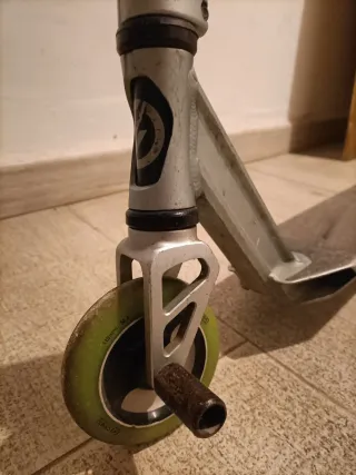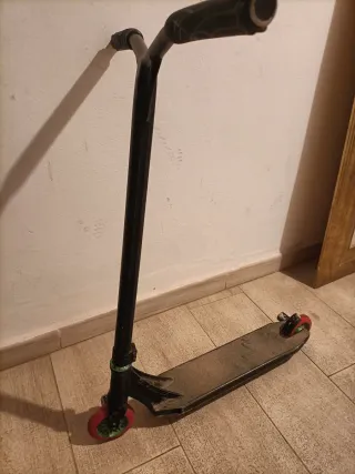 Patinete de estilo libre, perfecto para niños y adolescentes que se inician en el mundo del skate. - Manillar con puños verdes. - Base y horquilla de metal. - Ruedas verdes.