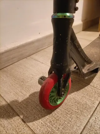 Patinete de estilo libre para niños y adolescentes de la marca Ethic DTC. Diseñado para la práctica de trucos y acrobacias. - Manillar negro. - Ruedas rojas con núcleo verde.