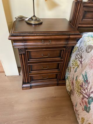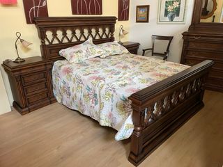 Conjunto de dormitorio de madera con un diseño rústico y elegante. - Muebles de madera maciza. - Acabado en tono oscuro. - Estilo clásico y atemporal. -Cama para colchon de 150