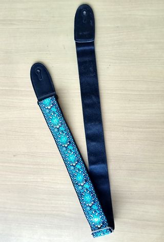 Correa para guitarra con un llamativo diseño en tonos azules. - Diseño de motivos florales. - Bordes en color negro. - Hebilla metálica para ajuste.