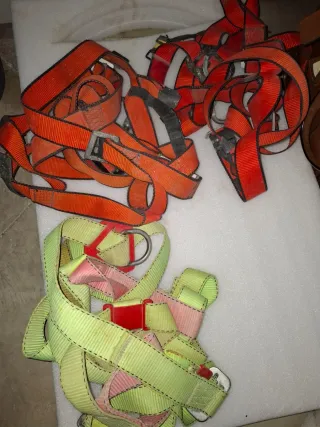 Conjunto de arneses de seguridad de colores. - Arnés de color naranja con hebillas metálicas. - Arnés de color verde con hebilla roja y anilla metálica.