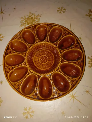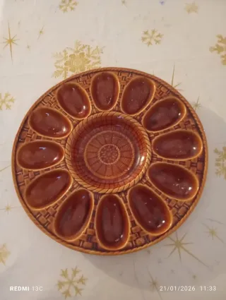 Huevera de cerámica de la marca Gil Vargas, fabricada en Sevilla. Presenta un diseño inspirado en una cesta tejida y un acabado en tono marrón brillante. - Diseño con 12 cavidades para huevos. - Centro con relieve decorativo.