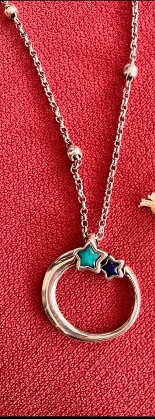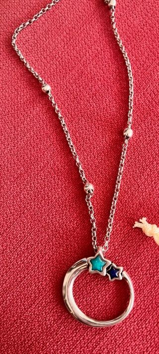 Elegante collar Estela con un diseño circular y dos estrellas. - Colgante circular de plata. - Dos estrellas decorativas, una en turquesa y otra en azul marino.