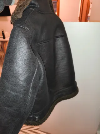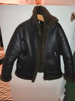 Chaqueta estilo aviador de Zara, con un diseño moderno y cálido. Talla 7 122 - Exterior en imitación piel. - Forro interior de pelo sintético. - Cuello alto con solapas. - Cierre de cremallera. - Bolsillos laterales con cremallera.