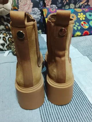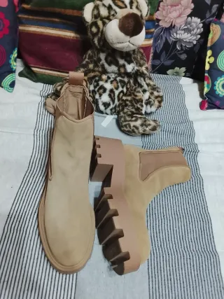 Botas de estilo Chelsea de Zara en tonos beige y marrón. Tienen un diseño moderno con plataforma. - Material exterior de ante. - Detalle de elástico lateral. - Tirador trasero para facilitar el calce. - Suela gruesa de plataforma.