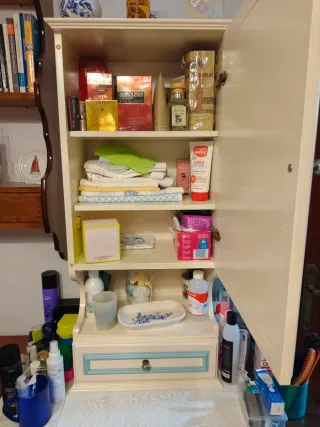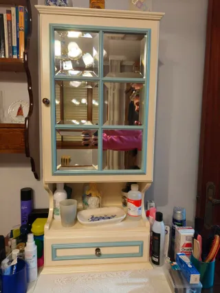 Armario de baño con un diseño encantador y práctico. - Estructura principal en color beige. - Detalles decorativos en azul. - Puertas con acabado de espejo. Puede ir a juego con el portarrollos azul y los toalleros que tengo publicados