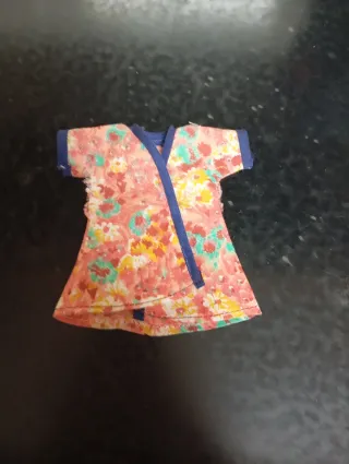 Precioso kimono para muñeca Alina con un estampado floral vibrante. - Diseño cruzado con ribete azul. - Mangas cortas. - Bajo con costura. - Estampado de flores en tonos rosas, amarillos y verdes.