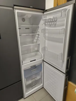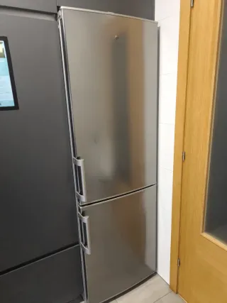 Nevera combi de la marca Teka con acabado en acero inoxidable. NO FROST - Diseño moderno y elegante. - Dos puertas con tiradores integrados. - Medidas --> 185 alto x 60 ancho x 56 fondo