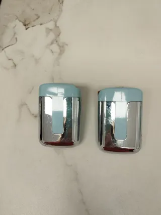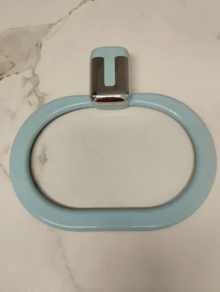 Conjunto de accesorios para el baño con un diseño moderno. Fabricado en plástico resistente. Incluye: - Toallero con aro ovalado. Toallero grande. 2 perchas. Estante ( que le faltan los embellecedorores laterales). - Todo acabado en azul y detalles cromados.