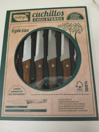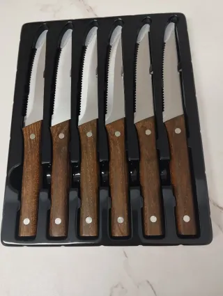 Conjunto de seis cuchillos con mangos de madera y hojas de metal. - Diseño elegante y funcional. - Aportan un toque rústico a la mesa.