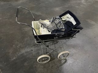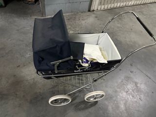 Cochecito de paseo para muñecas, con un diseño clásico y elegante. - Estructura metálica cromada. - Capota de tela azul marino. - Interior forrado en blanco. - Ruedas blancas con radios. incluye el Plástico para tapar el carricoche