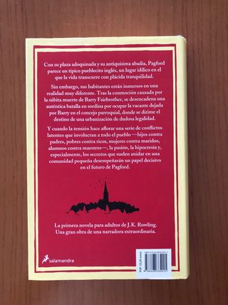 La primera novela para adultos de J.K. Rowling. Una gran obra de una narradora extraordinaria. La crítica ha dicho...«Una novela maravillosa. J.K. Rowling se sitúa a la altura de Stevenson, Conan Doyle y P.D. James. Sus dotes narrativas se combinan con su habilidad para crear personajes memorables y conmovedores, y el resultado es una novela muy representativa de Inglaterra, rebosante de rabia y ternura.»Melvyn Bragg, The Observer