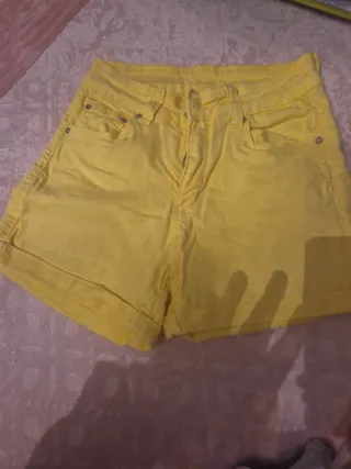 Pantalón corto elástico de color amarillo. - Cintura con trabillas para cinturón. - Cierre de cremallera y botón. - Bolsillos delanteros y traseros.