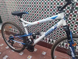 Bicicleta de montaña con suspensión delantera y trasera. - Ruedas de 26 pulgadas. - Cuadro blanco con detalles azules. - Sistema de frenos de disco. No se ha usado mas de dos veces. Su estado es inmejorable. Fue un regalo y no la uso. Negociable