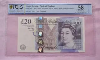 Billete de 20 libras del Banco de Inglaterra, emitido en 2007. Certificado por PCGS. - Serie: EC 38617280 - Firma: A. Bailey - Marca de agua: Reina Isabel II - Grado PCGS: 58 Choice AU
