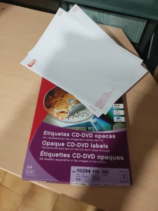 -Paquete de etiquetas opacas para CD y DVD de la marca APLI. -Permiten que las imágenes y textos del CD no se transparenten. -82 hojas formato A4, 3 etiquetas por hoja. -Ideales para impresión Inkjet y Láser. -Disponemos de otros artículos que te pueden interesar, mira en mi perfil, gracias. -Realizamos envíos. Cod.26/002