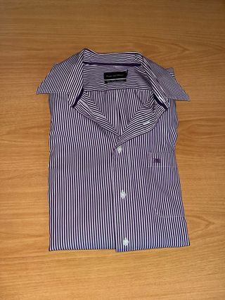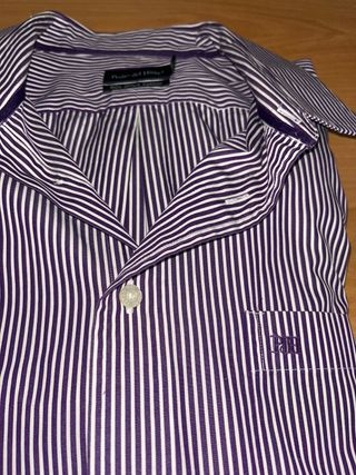 Camisa de vestir de la marca Pedro del Hierro, con un elegante diseño de rayas verticales en morado y blanco. Es una prenda sin estrenar, ideal para ocasiones formales o para el día a día. - Diseño de rayas verticales. - Cuello clásico. - Cierre de botones. - Bolsillo en el pecho con logo bordado.