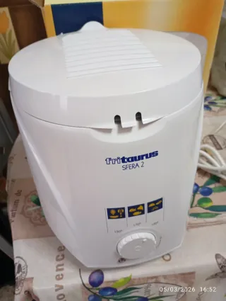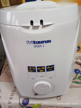 Freidora de aceite Fritaurus Sfera 2, completamente nueva y sin usar. - Diseño moderno y compacto. - Indicadores de temperatura: 150°, 170°, 190°. - Color blanco.