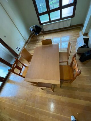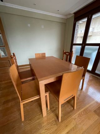 Mesa de comedor ampliable, ideal para espacios que necesitan flexibilidad. Su diseño se adapta a diferentes necesidades. con sus sillas - Fabricada en madera. - Color marrón.