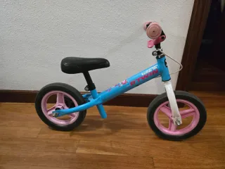 Bicicleta de equilibrio B'TWIN en color azul con detalles en rosa. - Ruedas de goma. - Manillar con puños rosas. - Sillín negro. Ha tenido mucho uso pero aún se puede usar mucho más, ideal para aprender equilibrio antes de pasar a la bici de pedales.