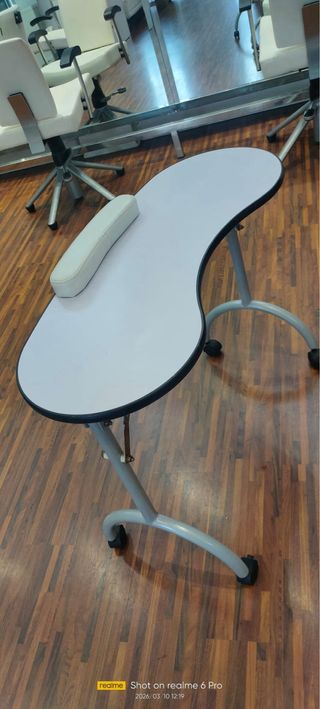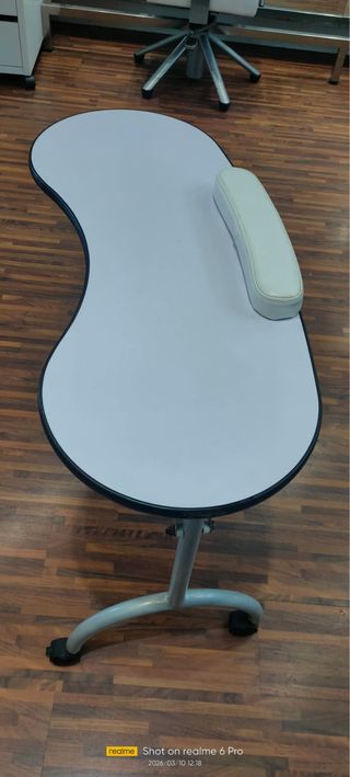 Mesa auxiliar plegable, ideal para manicuras. Su diseño curvo se adapta cómodamente. - Superficie de trabajo amplia. - Reposabrazos acolchado. - Base con ruedas para fácil movilidad.